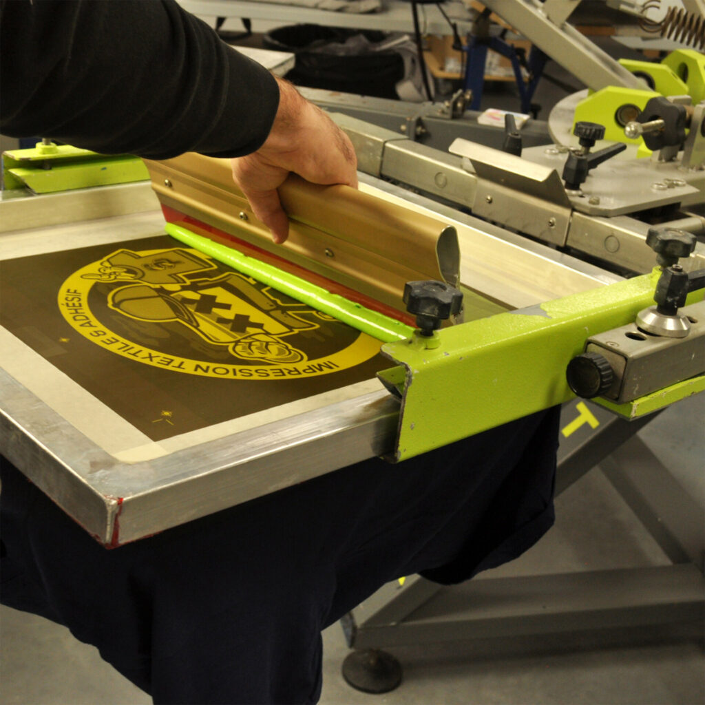 Pour les moyennes et grandes séries — Grande polyvalence des supports : coton, polyester, tissus, papier, plastique, bois, métal, etc. — Tenue au lavage irréprochable — Impression jusqu’à 6 couleurs ( quadri et indexation de couleurs, Pantone et Fluo) — Encres à effets spéciaux ( gonflant, gloss, éponge et phosphorescent ).